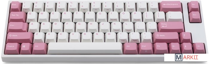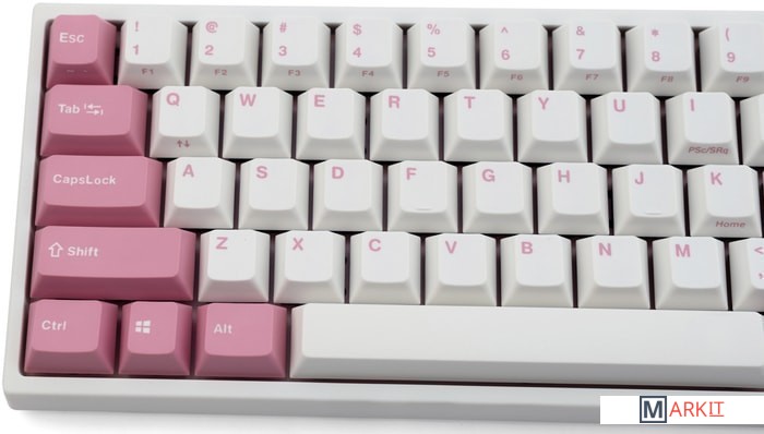 КЛАВИАТУРА БЕЗ КИРИЛЛИЦЫТип: линейныйСила нажатия: 45 грамм (легкие)Длина пути: 4 мм (2 мм до срабатывания)Данная модель имеет няшную бело-розовую расцветку, прямо как у Hello Kitty. Собрана клавиатура добротно и монолитно, а сочетание высококачественных double-shot PBT клавиш с переключателями Cherry MX и звукопоглощающей подложки позволяет сделать печать на клавиатуре максимально тихой (насколько это возможно для механики). Mini-USB порт вынесен на верхний правый торец клавиатуры, поэтому если вы часто носите клавиатуру с собой, подключение и отключение клавиатуры будет мгновенным и без лишней возни.За счет использования FN-слоя клавиатура имеет аналогичную полноразмерным клавиатурам функциональность при своем компактном размере.DIP-переключатели на задней панелиДают возможность поменять местами функции кнопок Ctrl и Caps Lock, Windows и Alt, Windows и Fn или отключить Windows.Звукопоглощающая подложкаПоглощает звуки при нажатии, делая процесс печати более тихим по сравнению с обычными механическими клавиатурами.Низкопрофильные клавиши Step-Sculpture2Данные клавиши заметно ниже и имеют оптимальный угол наклона, из-за чего, по отзывам, печатать приятнее и комфортнее, чем на более высоких клавишах.Функция Full N-key Rollover по PS/2 (NKRO)Стандартное подключение через USB позволяет одновременно нажимать до 6 клавиш (6KRO), этого хватит любому обычному человеку независимо от его скорости печати.Подключение через PS/2 разрешает одновременно нажимать любое количество клавиш (NKRO) — пригодится геймерам, которым нужно часто прожимать более 6 клавиш почти моментально.